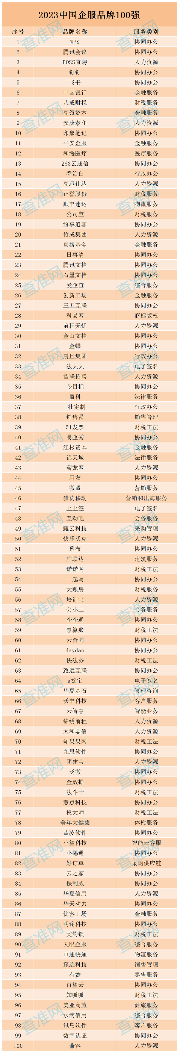 2023年5月20日,查准网发布“2023中国企服品牌TOP100”榜单,位列榜单前三位的分别是WPS、腾讯会议、BOSS直聘。该榜单主要从用户站内搜索、入驻服务商访问次数及人力资源第三方平台HR价值网提供品牌数据监测等综合进行制作。